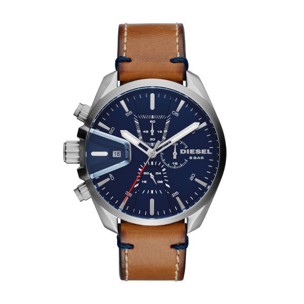 Diesel DZ4470 herenhorloge. Stalen heren horloge met lederenband. Blauwe Wijzerplaat met chronograaf functie. 10ATM waterdicht, mineraalglas.